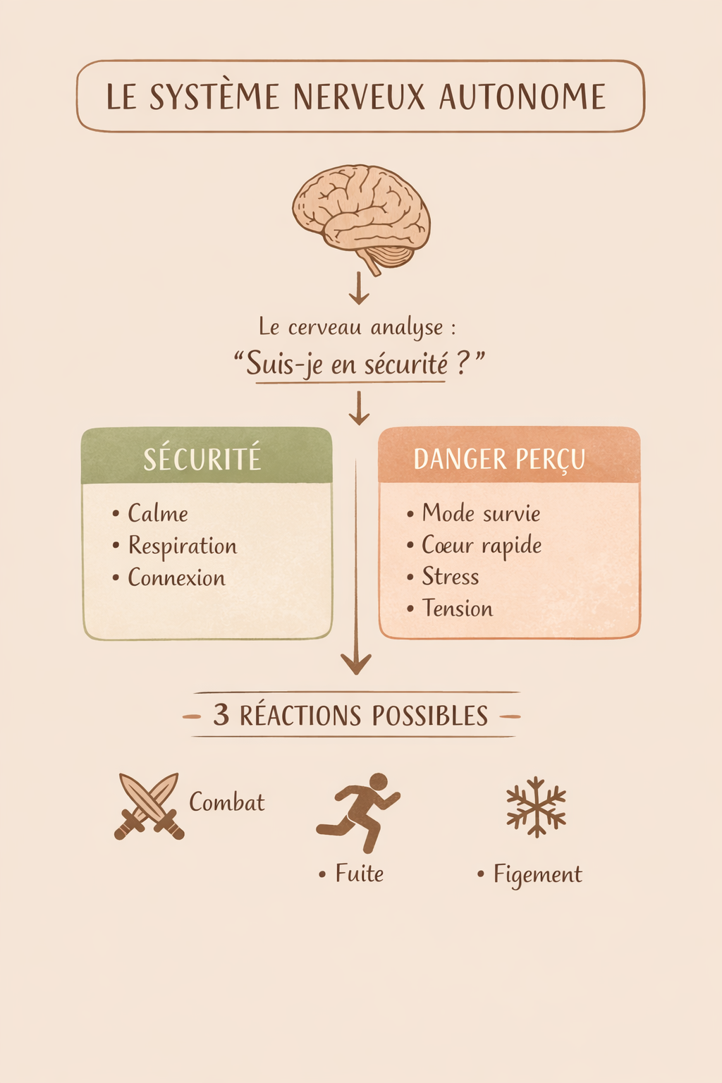 Certaines personnes ont l’impression d’être toujours sur le qui-vive, comme si leur corps était en alerte permanente. Ce phénomène s’explique souvent par le fonctionnement de notre système nerveux autonome, un mécanisme naturel qui gère nos réactions face au danger. Comprendre ce système permet de mieux comprendre pourquoi nous passons parfois en mode survie… et comment en sortir.